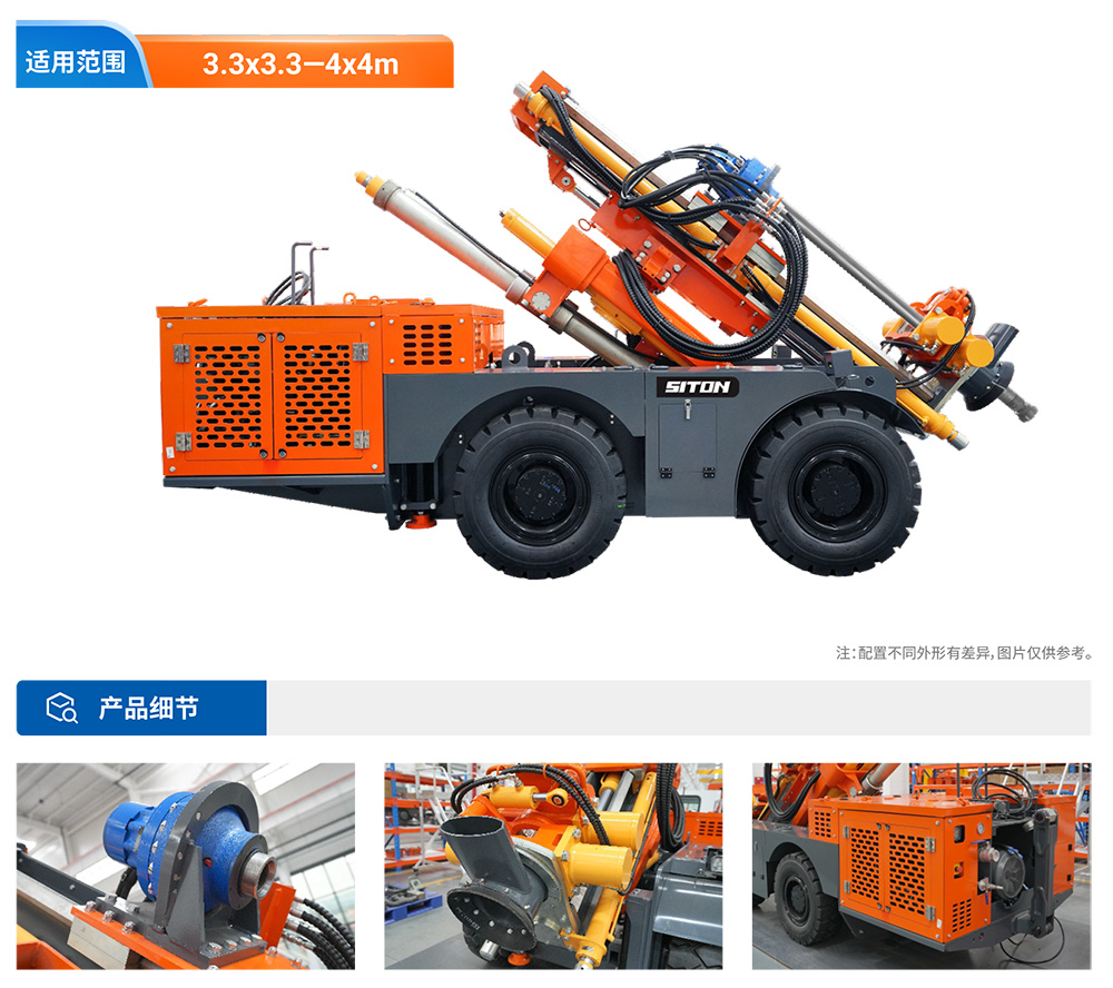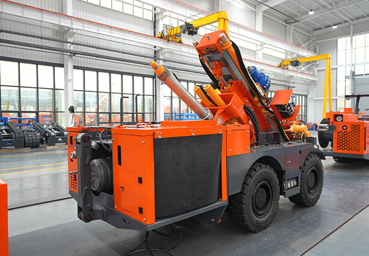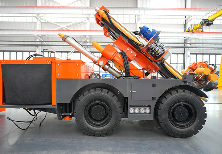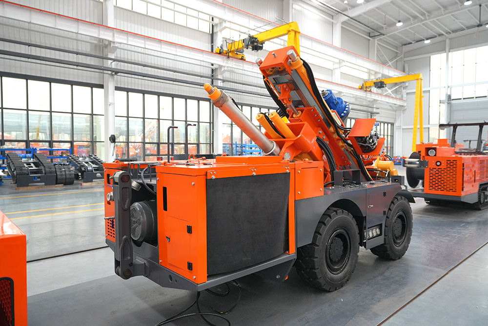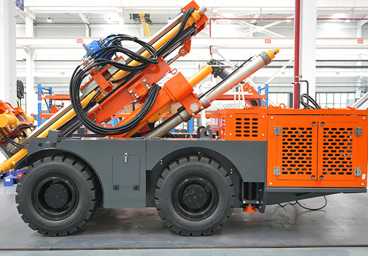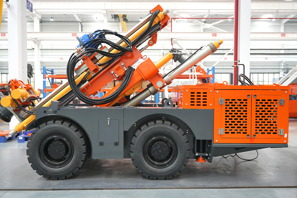 KODT-125是一款輪胎式礦用潛孔鉆機,電壓等級:380V,采用潛孔沖擊器作業(yè),閉式四驅(qū)液壓系統(tǒng),適用于3.3-4m地下采場環(huán)形孔的穿鑿,是專用的穿孔設備,也可用于天井和斜井的開鑿及回采作業(yè)。主要功能和裝置如下:適用于鉆孔直徑范圍120-254mm,鉆孔深度0-100m;鉆架可環(huán)向360°旋轉,前后-10°-55°度擺動,適用于環(huán)向打孔;鉆臂裝載有液壓穩(wěn)桿機構,保證鉆孔直度,偏斜率≤1%;機身配有頂升支腿和后擺動橋,可在路面坑洼惡劣條件下工作;設備四驅(qū)驅(qū)動,可實現(xiàn)360°轉彎,原地掉頭;長距離移動時,設備可解鎖制動,且配備牽引,方便使用拖車進行快速移動;鉆機回轉具有無級調(diào)速功能,可根據(jù)不同巖層狀況調(diào)整鉆速,提高效率;且設備配置遙控裝置,方便操作人員操作設備的同時,提高了操作安全性和可靠性;設備配備了沖洗裝置,方便操作人員清理設備,維持設備整潔,提高設備使用壽命。