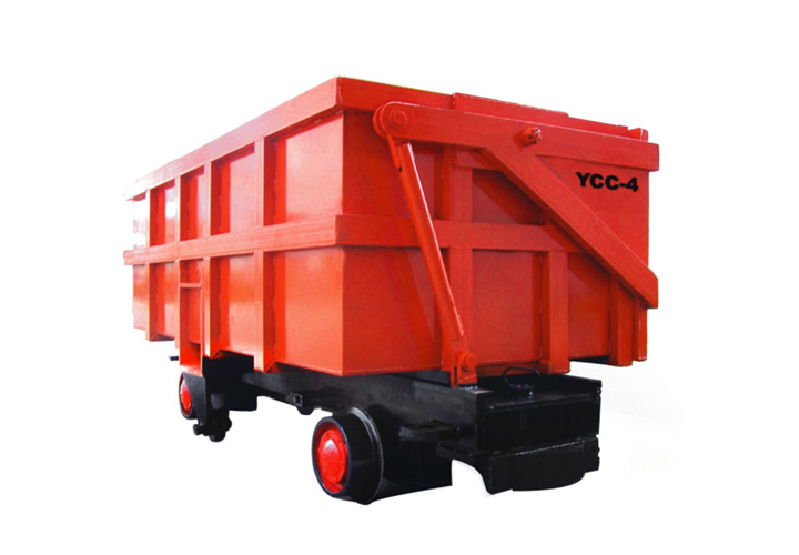 曲軌式側(cè)卸翻斗礦車,是在礦車行進(jìn)過程中,由卸載輪臂經(jīng)過卸載曲軌來實(shí)現(xiàn)車箱自動傾翻卸料和自動復(fù)位。卸礦是在機(jī)車牽引下,當(dāng)卸載輪爬上曲軌時,車箱翻轉(zhuǎn),車門自動打開實(shí)現(xiàn)卸料,車走過曲軌后車箱恢復(fù)原位,車門自動鎖固。