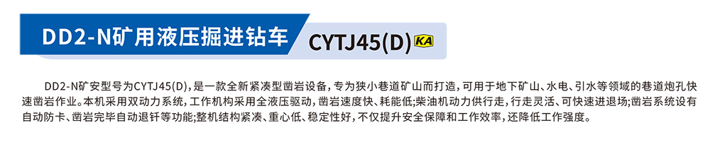 DD2-N礦安型號為CYTJ45(D),是一款全新緊湊型鑿巖設備,專為狹小巷道礦山而打造,可用于地下礦山,水電、引水等領域的巷道炮孔快速鑿巖作業(yè)。本機采用雙動力系統(tǒng),工作機構(gòu)采用全波壓驅(qū)動,鑿巖速度快、耗能低:柴油機動力供行走,行走靈活、可快速進退場;鑿巖系統(tǒng)設有自動防卡、鑿巖完畢自動退釬等功能;整機結(jié)構(gòu)緊湊、重心低、穩(wěn)定性好,不僅提升安全保障和工作效率,還降低工作強度。