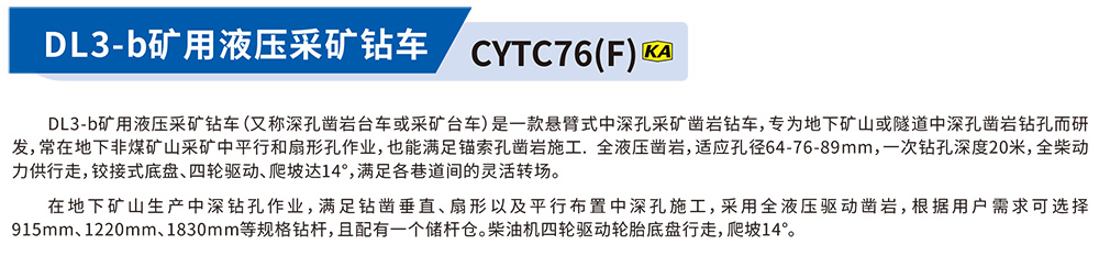 DL3-b礦用液壓采礦鉆車(又稱深孔鑿巖臺車或采礦臺車)是一款懸臂式中深孔采礦鑿巖鉆車,專為地下礦山或隧道中深孔鑿巖鉆孔而研發(fā),常在地下非煤礦山采礦中平行和扇形孔作業(yè),也能滿足錨索孔鑿巖施工,全液壓鑿巖,適應(yīng)孔徑64-76-89mm,一次鉆孔深度20米,全柴動力供行走,鉸接式底盤、四輪驅(qū)動、爬坡達(dá)14°,滿足各巷道間的靈活轉(zhuǎn)場。在地下礦山生產(chǎn)中深鉆孔作業(yè),滿足鉆鑿垂直、扇形以及平行布置中深孔施工,采用全液壓驅(qū)動鑿巖,根據(jù)用戶需求可選擇915mm、1220mm、1830mm等規(guī)格鉆桿,且配有一個儲桿倉。柴油機(jī)四輪驅(qū)動輪胎底盤行走,爬坡14°。