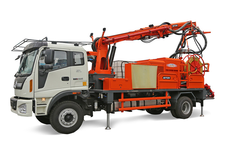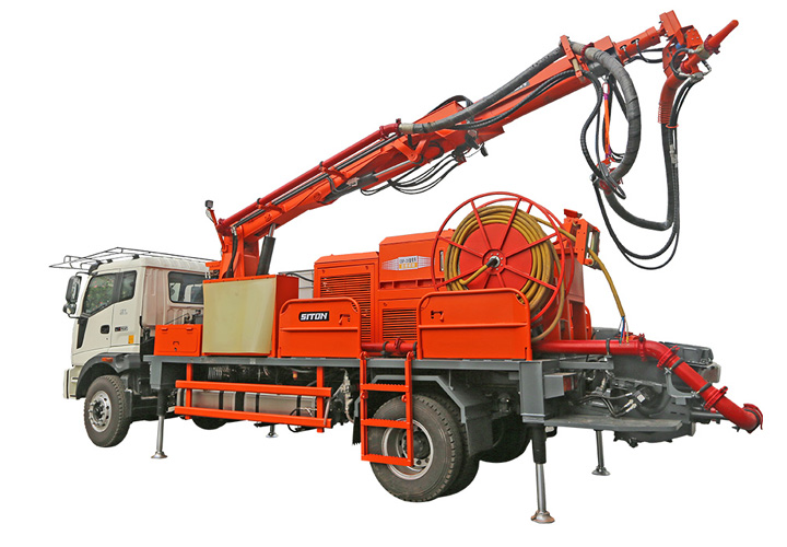 CSP30車載式濕噴臺車(又稱濕噴機(jī)械手)是綜合國內(nèi)外濕噴機(jī)技術(shù)研發(fā)的車載式濕噴機(jī),解決了傳統(tǒng)小型濕噴機(jī)不能滿足長大隧道、混凝土噴射效率低、回彈大等不足,同時改善了隧道內(nèi)部混凝土噴射施工人員的作業(yè)環(huán)境,提高了施工效率、降低回彈減少了混凝土消耗量,切實保障施工質(zhì)量,汽車通用底盤搭載機(jī)械手及工作動力系統(tǒng),使得轉(zhuǎn)場迅速,是高速、高鐵、水利水電等地下隧道工程施工的噴漿利器。 CSP30車載式濕噴臺車是一種濕噴機(jī)組,平行作業(yè)工作范圍寬25mX高15.8m巷道,每小時可噴30m3,行走在25%坡度、可噴頂邦、側(cè)邦、底板、掌子面任意位置無死角噴射;該機(jī)作業(yè)機(jī)構(gòu)采用全液壓驅(qū)動,采用汽車通用底盤柴油動力行走90km/h,自動慘量速凝劑。