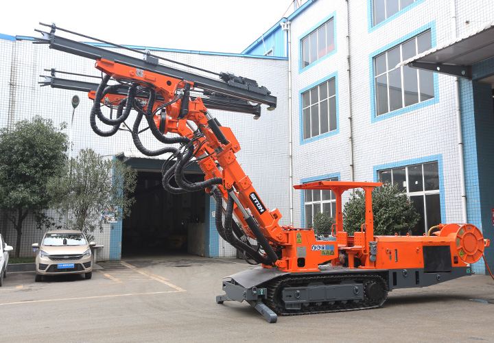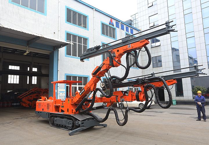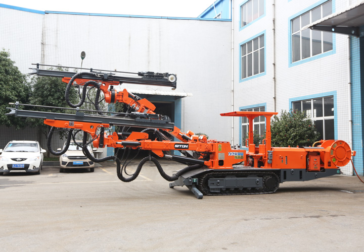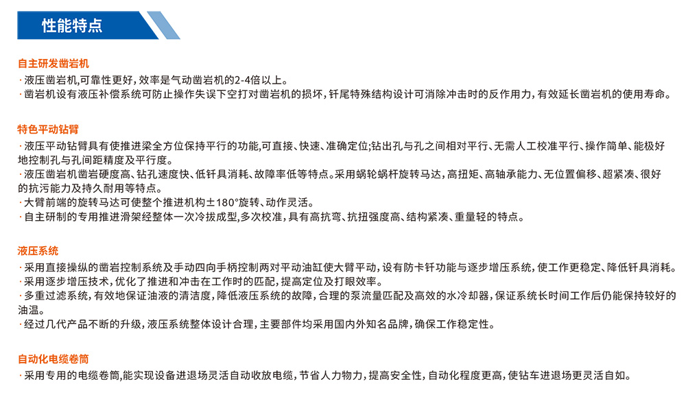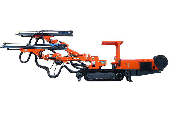 自主研發(fā)生產(chǎn)的履帶式掘進(jìn)鉆車,設(shè)備用于煤礦、金屬礦掘進(jìn)等領(lǐng)域的巷道隧道掘進(jìn)時(shí)所需爆破孔作業(yè)。工人可站在安全處遠(yuǎn)程操作機(jī)械手臂鑿巖,代替人工手持風(fēng)鉆打孔作業(yè),降低人工作業(yè)強(qiáng)度、提高工作效率及安全系數(shù)。該機(jī)型適用于斷面(寬x高)3.0mx3.0m至7.2mx5.5m,爬坡≤14°,行走速度可達(dá)1.8km/h。工作機(jī)構(gòu)采用全液壓驅(qū)動,鑿巖速度可達(dá)0.8-2m/min,采用全液壓驅(qū)動,系統(tǒng)先進(jìn),操作便捷,鑿巖速度快、機(jī)動靈活、爬坡能力強(qiáng)、檢修方便、作業(yè)穩(wěn)定、安全可靠。