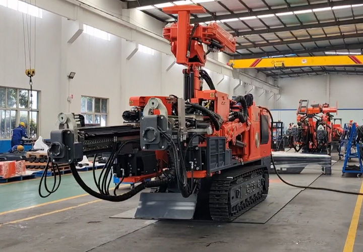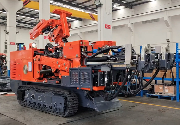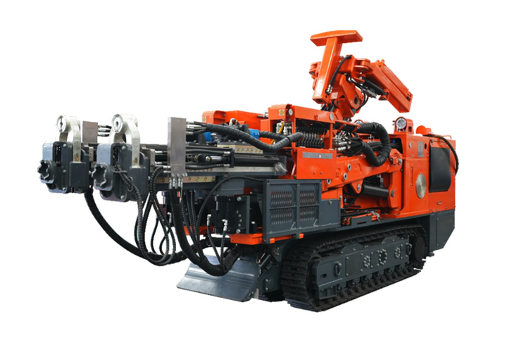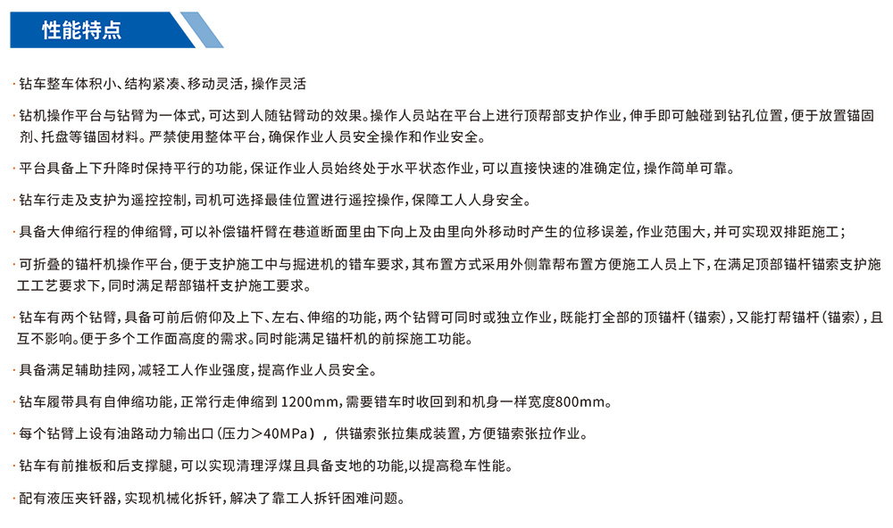 煤礦用液壓錨桿鉆車是款新型巷道支護(hù)機(jī)械設(shè)備,該機(jī)與據(jù)進(jìn)機(jī)組配套使用,能快速完成支護(hù)工作,實(shí)現(xiàn)作業(yè)平衡,提高機(jī)械化。主要用于煤巖和半煤巖巷道工作面支護(hù)作業(yè),能夠同時(shí)實(shí)現(xiàn)巷道頂部和側(cè)幫錯(cuò)桿錯(cuò)索支護(hù),還具有煤層內(nèi)鉆炮孔及探測(cè)孔(探水、探瓦斯)等功能。設(shè)備結(jié)構(gòu)緊湊、外形尺寸小,采用電動(dòng)液壓系統(tǒng)作為動(dòng)力源,具有節(jié)約能源本質(zhì)安金、效率高等特點(diǎn)。底盤采用履帶結(jié)構(gòu)形式,采用韓國(guó)斗山原裝進(jìn)口液壓馬達(dá)驅(qū)動(dòng)履帶行走,可在潮濕有積水的巷道里工作。該機(jī)適用于煤礦煤巷、半煤巷及坡度小于士15°斜巷掘進(jìn)中的支護(hù)作業(yè)。