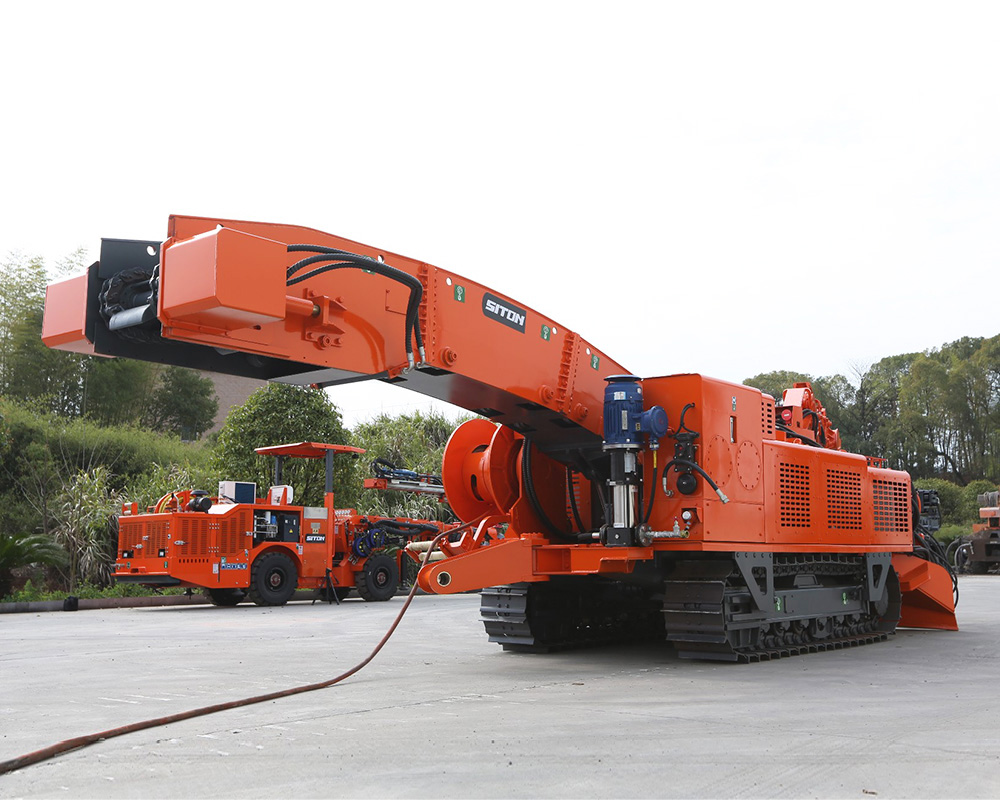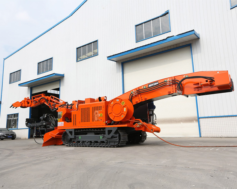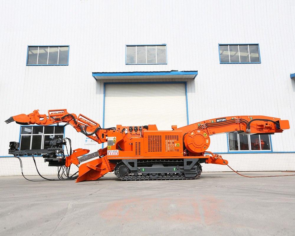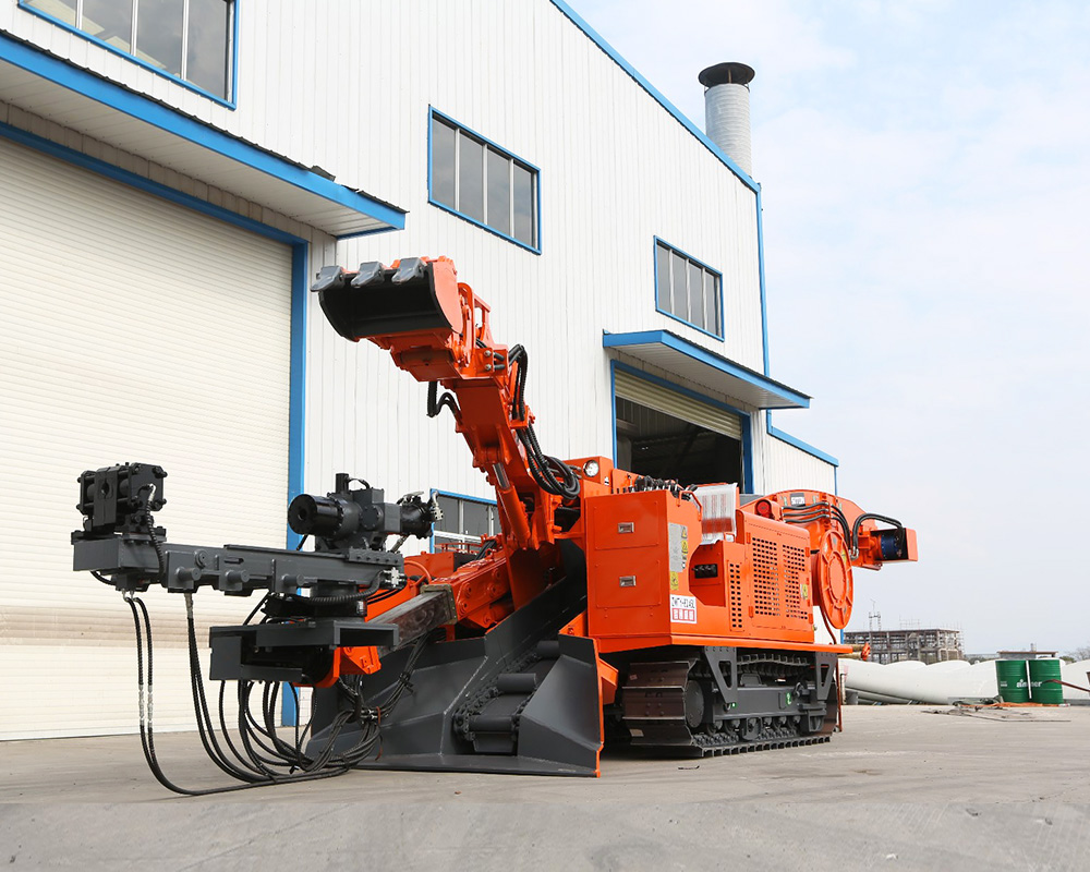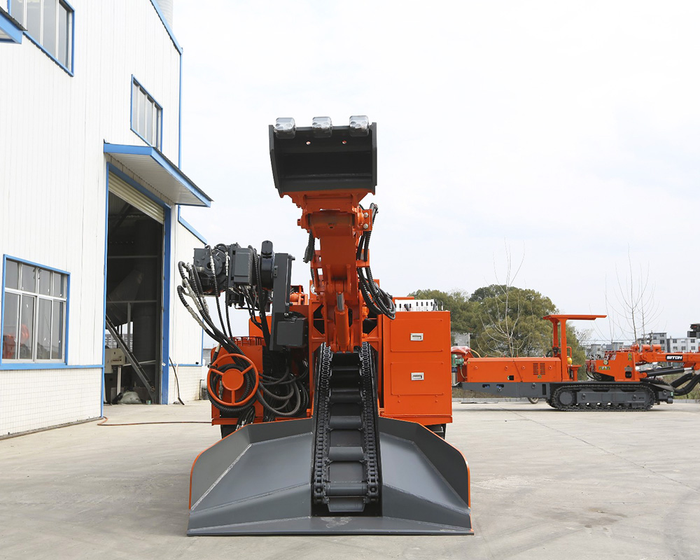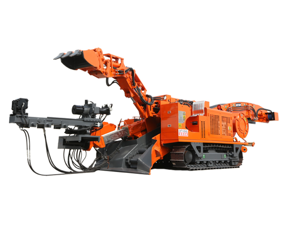 CZWTY-80煤礦用挖裝探機組是一種集裝載、鉆探兩種功能于一體的作業(yè)裝備。用于礦山巖巷、引水洞以及其它工程巷道中的掘進作業(yè)。其應(yīng)用提高了掘進速度,降低了工人的勞動強度,掘進施工作業(yè)提高了安全,很好的實現(xiàn)了巖巷掘進的機械化作業(yè)需求。同時解決了中小巷道多種設(shè)備錯不開車的問題。挖裝探機組鉆臂可對巷道迎頭工作面鉆探測孔,也可以鉆瓦斯釋放孔。反鏟機構(gòu)扒臂扒取遠處的巖石,送入刮板運輸機,刮板運輸機從尾部將巖石卸入礦車或皮帶運輸機中,也可以用扒斗來清理工作面。