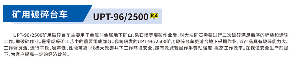 UPT-96/2500礦用破碎臺車主要用于金屬非金屬地下礦山,采石場等爆破作業(yè)后,對大塊礦石需要進行二次破碎滿足后序的鏟裝和運輸工作,即破碎作業(yè)。是常規(guī)采礦工藝中的重要組成部分。我同研發(fā)的UPT-96/2500礦用破碎臺車更適合地下采掘作業(yè)。該產(chǎn)品具有破碎能力大。工作臂靈活、運行平穩(wěn)、噪聲低、性能可靠;能極大改善井下工作環(huán)境安全,能有效減輕操作手勞動強度,提高工作效率。在保證安全生產(chǎn)前報下,為客戶提高一定的經(jīng)濟效益。