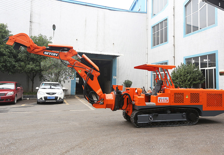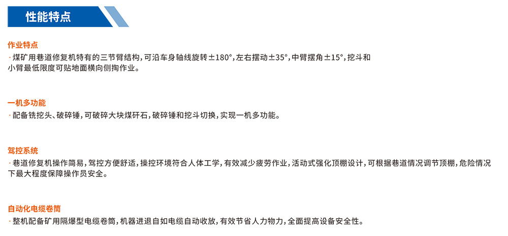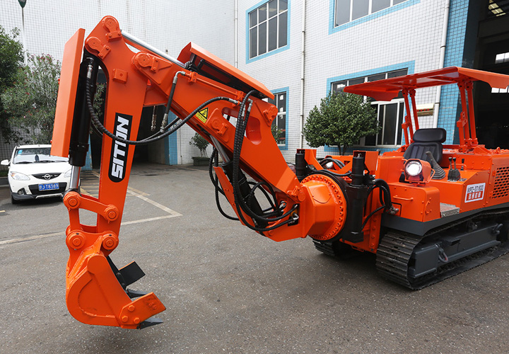 煤礦用巷道修復(fù)機是一款多功能巷道修護設(shè)備,主要用于煤巷、半煤巖巷、全巖巷,可對巷道頂板、底板及側(cè)幫進行破碎、挖裝、鏟平等日常維護作業(yè),同時也對大塊巖石、煤塊進行破碎,便于清運。該設(shè)備具有挖掘、側(cè)掏、翻轉(zhuǎn)、破巖、裝車、起吊等各項作業(yè)能力,可實現(xiàn)挖掘毛水溝、臥底、破巖、清理浮煤、清理皮帶機底部、平整巷道及小型配件吊裝等多項作業(yè)。該機可配備破碎錘、錨桿機及錨桿切斷器,實現(xiàn)破巖、錨桿(索)切斷,裝配特有的架梁裝置,可輔助裝卸U型梁。